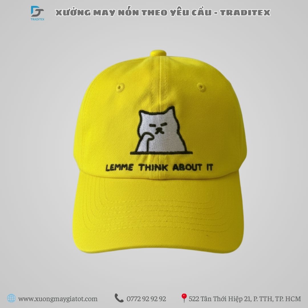 Công nghệ thêu logo hiện đại: Hình ảnh chú mèo cùng dòng chữ “Lemme think about it” trên mẫu nón vàng là minh chứng cho độ sắc nét, không bung chỉ và bền bỉ theo thời gian.