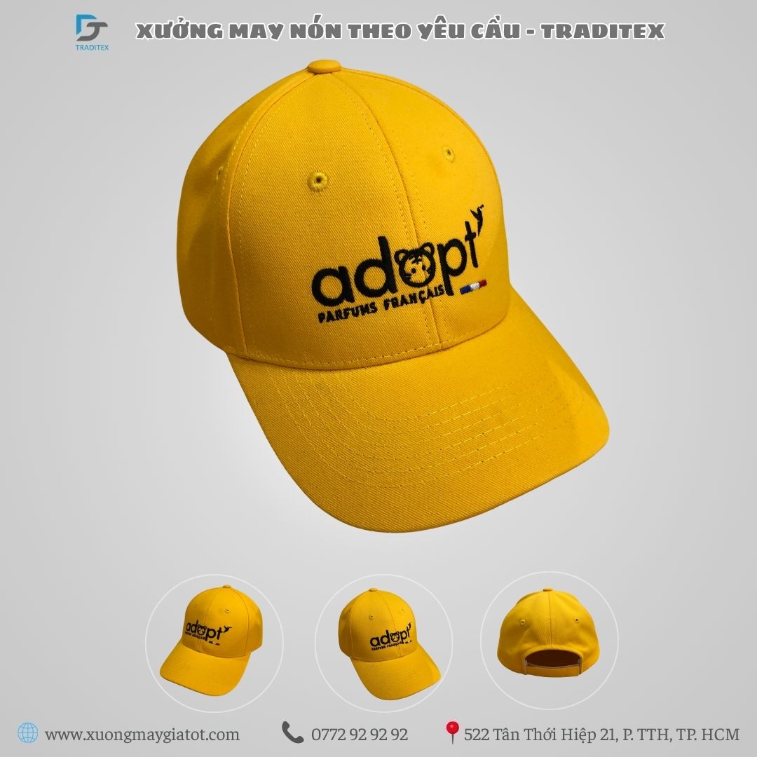Nón quảng cáo không chỉ là vật phẩm quà tặng, mà là một công cụ Marketing di động mạnh mẽ. Tại XƯỞNG MAY NÓN TRADITEX, chúng tôi chuyên cung cấp dịch vụ may nón quảng cáo chất lượng cao, giúp thương hiệu của bạn nổi bật và lan tỏa mạnh mẽ như mẫu nón vàng tươi của thương hiệu nước hoa Adopt.